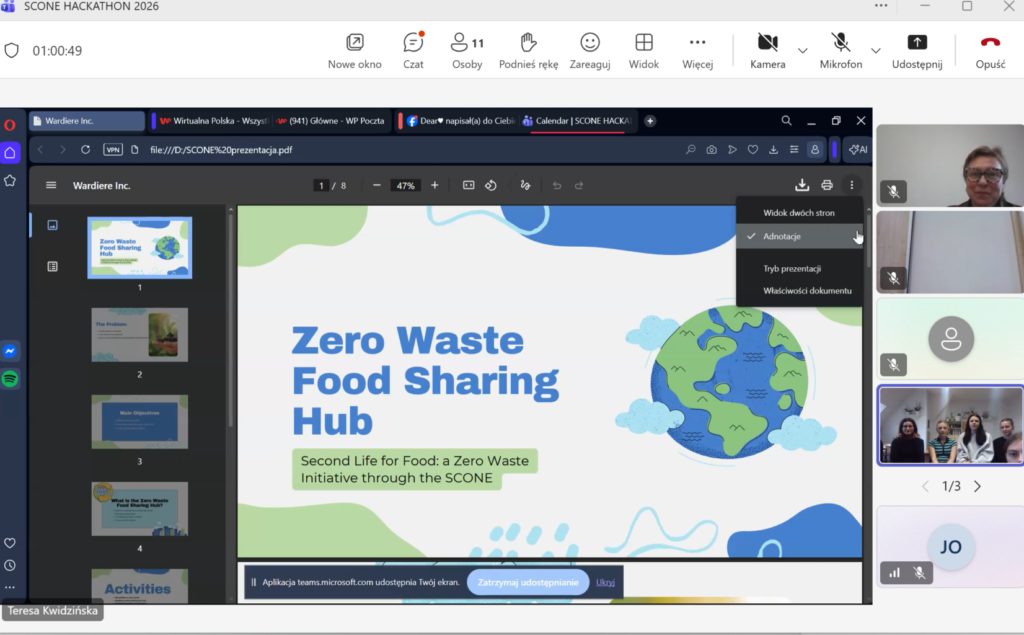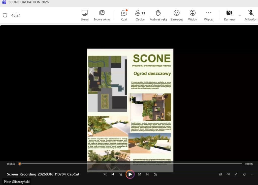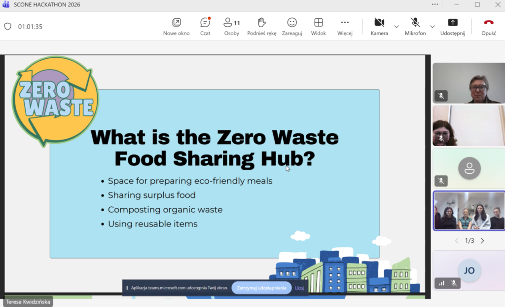 W dniu wczorajszym odbył się finałowy etap międzynarodowego szkolnego Hackathonu zorganizowanego w ramach projektu #SCONE. Podczas wydarzenia nastąpiła prezentacja projektów dotyczących zrównoważonego rozwoju. Spotkanie zorganizowane zostało w formule on-line, a tematyka dotyczyła zrównoważonego rozwoju i zielonych innowacji.